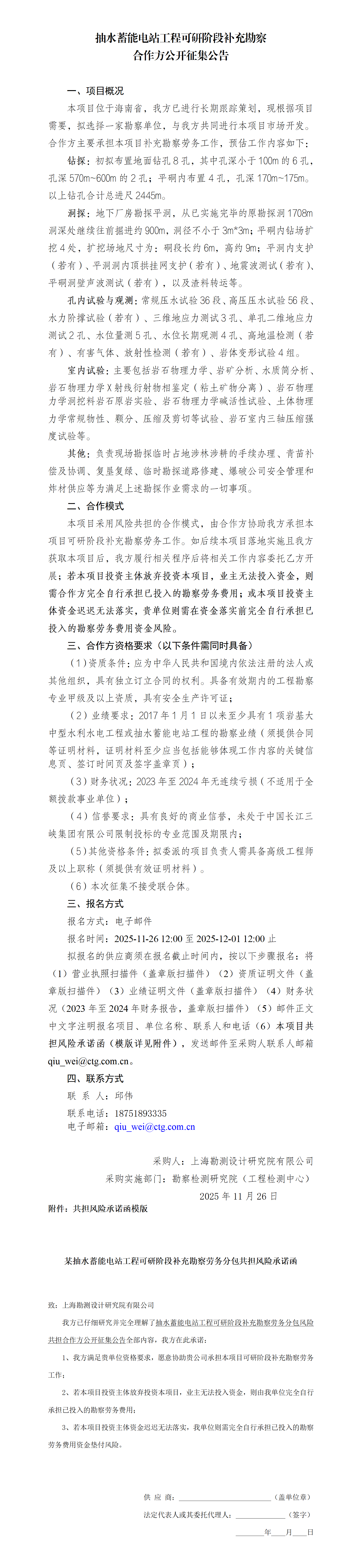 抽水蓄能電站工程可研階段補充勘察合作方公開征集公告