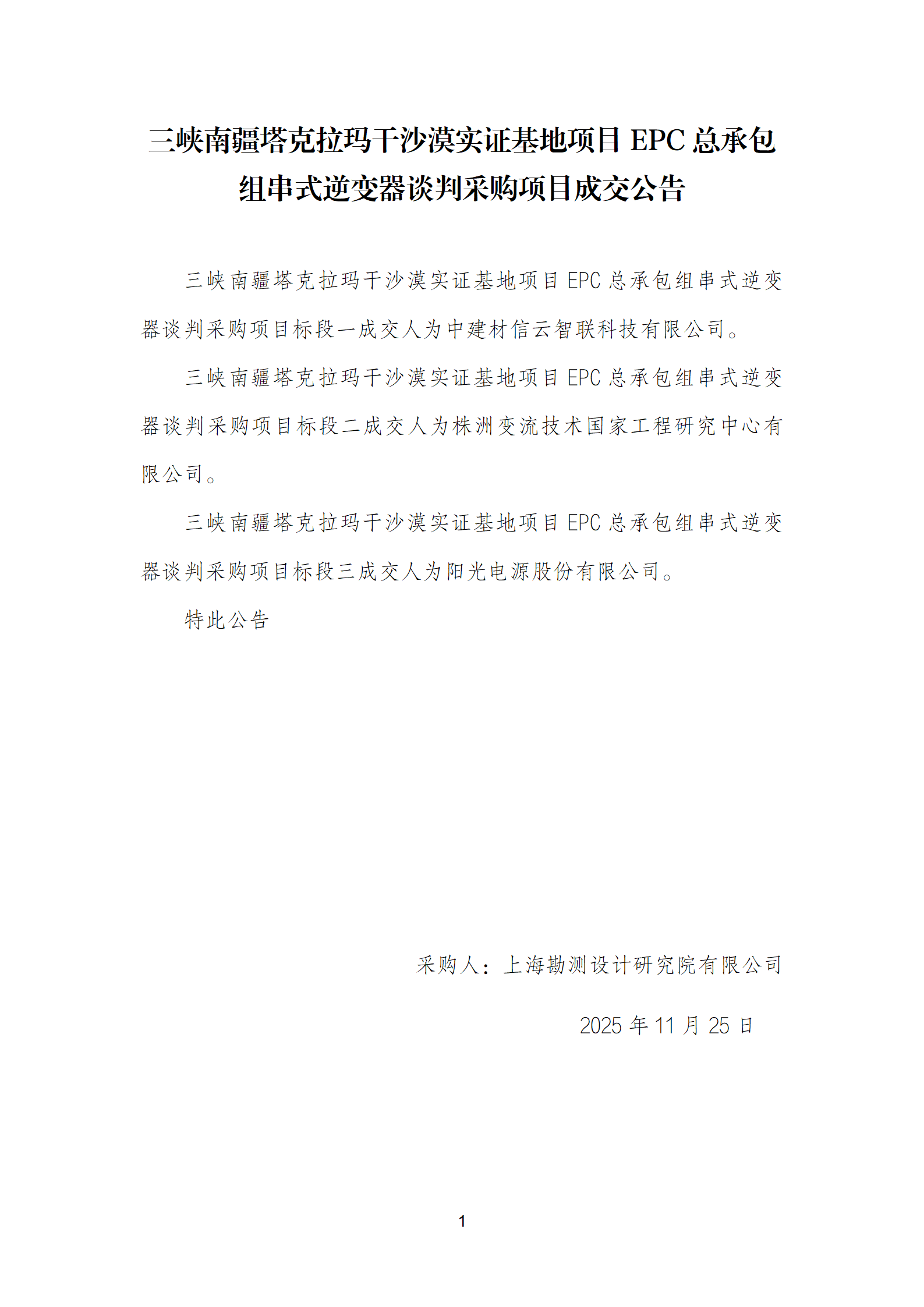 三峽南疆塔克拉瑪干沙漠實證基地項目EPC總承包組串式逆變器談判采購項目成交公告